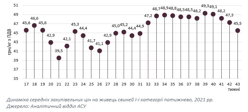 Сезонне послаблення цін, спричинене переорієнтацією споживачів на альтернативні види білка та їх підготовки до опалювального сезону, цьогоріч прийшло із запізненням. Так, зазвичай, низхідний рух цін на свинину під впливом сезонного пониження споживчої активності починається у другій половині вересня. Проте цьогоріч досить сприятливі погодні умови першої половини осені та помірніша внутрішня пропозицїя свинини дозволили відтермінувати початок «осіннього цінопаду». При цьому, враховуючи традиційні цінові коливання на ринку свинини, деякі гравці ринку очікують відновлення позитивної динаміки вже у кінці листопада чи на початку грудня. Тож період несприятливої цінової ситуації цієї осені може бути дещо коротшим ніж зазвичай.