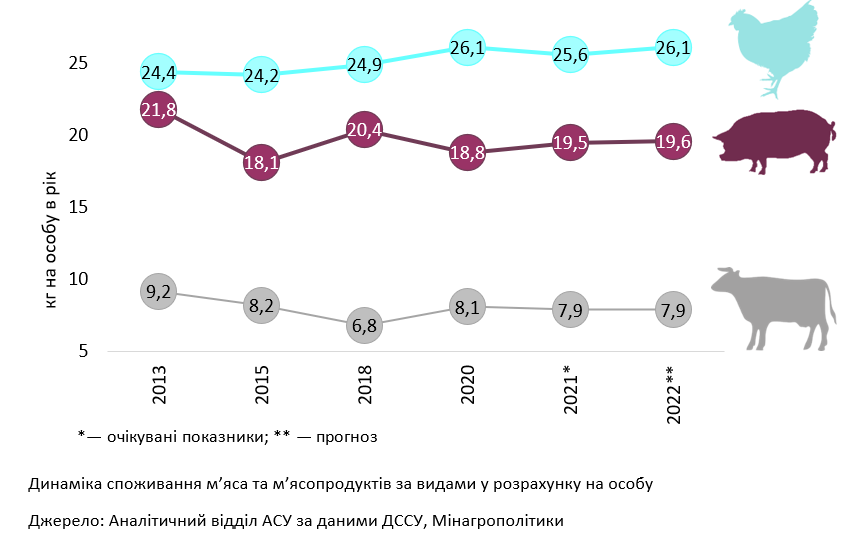 Профільне міністерство оцінює цьогорічне середньодушове споживання свинини та м’ясних виробів з неї у 19,5 кг на особу (в перерахунку на м’ясо). Це на 0,7 кг чи 3,7% перевищує минулорічний показник. Такий приріст «перекрив» відповідне скорочення споживання яловичини та м’яса птиці, тож м’ясний раціон середньостатистичного українця за попередніми оцінками залишається на рівні 2020-го — 53,8 кг у перерахунку на м’ясо.