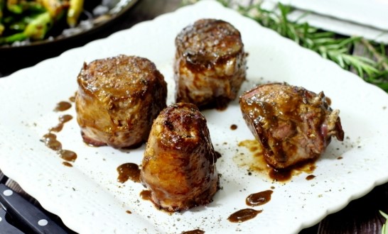 1.Свинячу вирізку розріжте на 4 шматки. Кожен шматок загорніть по боках шинкою чи беконом та сколіть зубочисткою.