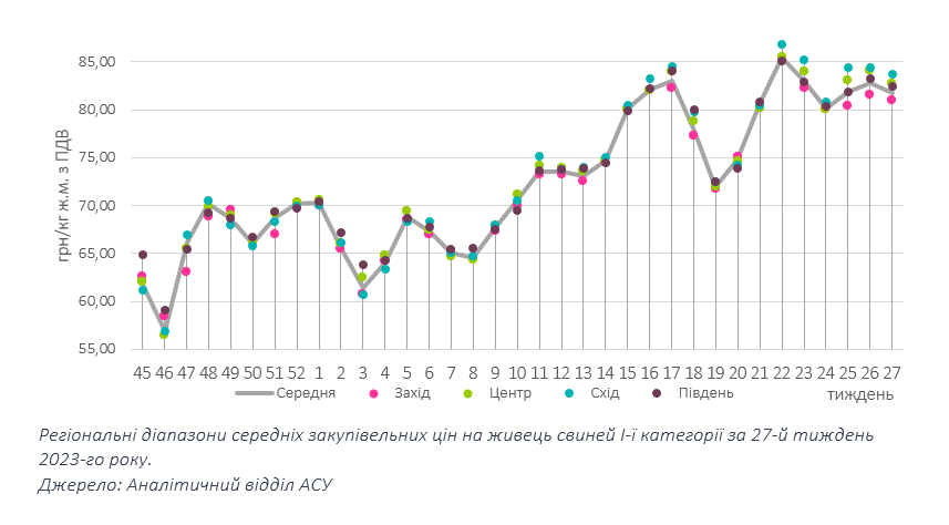 За підсумками останніх торгів червня, ціни закупівлі на початку нового місяця на свинину живою масою посунулися на 1 грн/кг у бік пониження, проте регіональна розбіжність цін зберіглася. Так, у Центрі закупівельні ціни коливалися в межах 81-84 грн/кг, на Сході мінімальна позначка була на гривню вищою, а на Заході переважно становили 80-82 грн/кг.