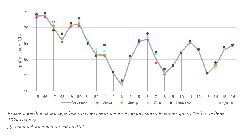 У ході минулих торгів котирування на ринку живця зміцнилися на 1–2 грн/кг чи у середньому на 2,2%. Незалежно від регіону більшість товарних партій цього тижня закуповували по 63–65 грн/кг, а середньоринкова позначка склала 64,5 грн/кг. Така зміна цін підкріплювалася відповідними спостереженнями виробників свинини, які свідчили про спроби заготівельників закупити додаткові об’єми та спроби забронювати товарні партії заздалегідь.