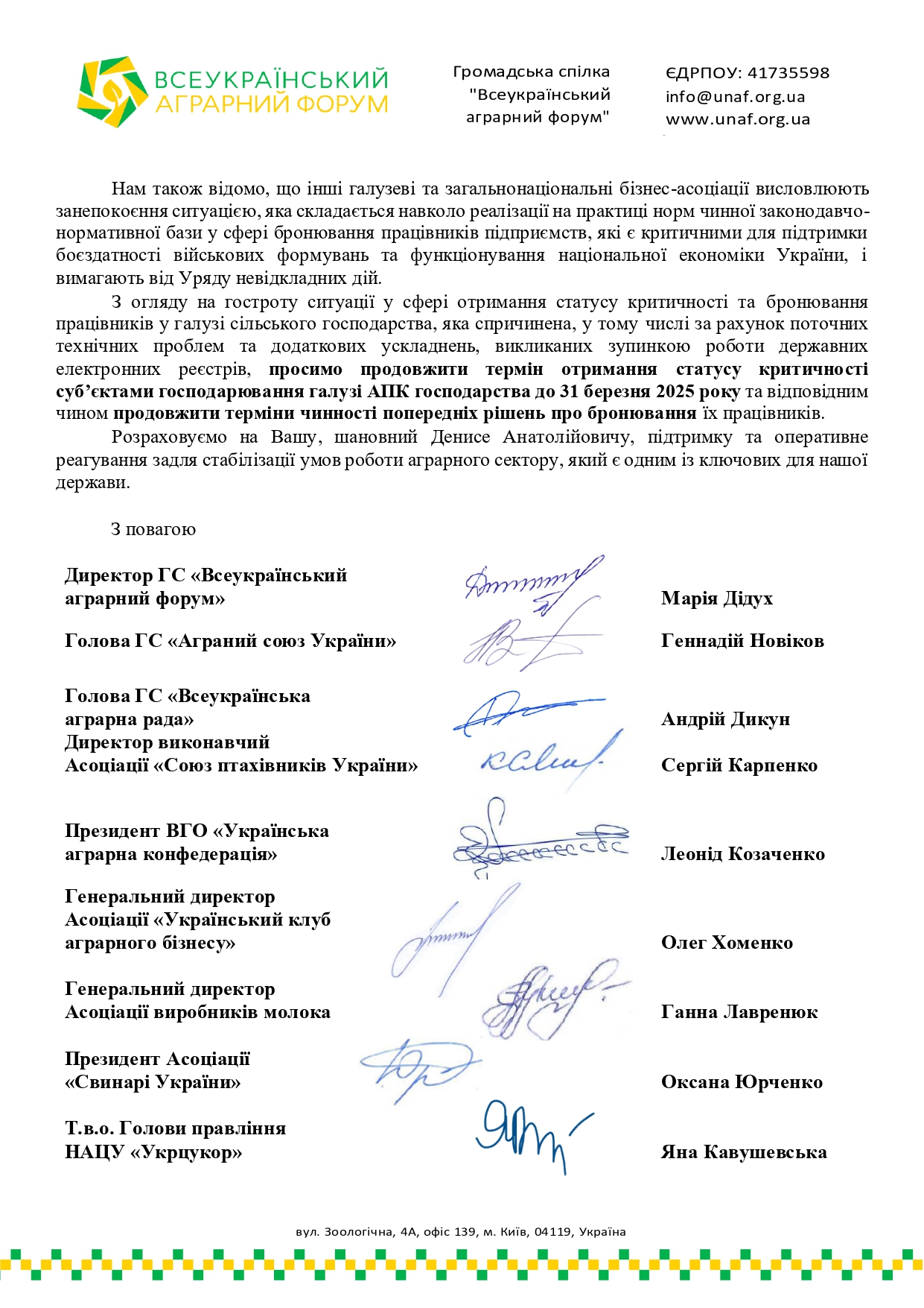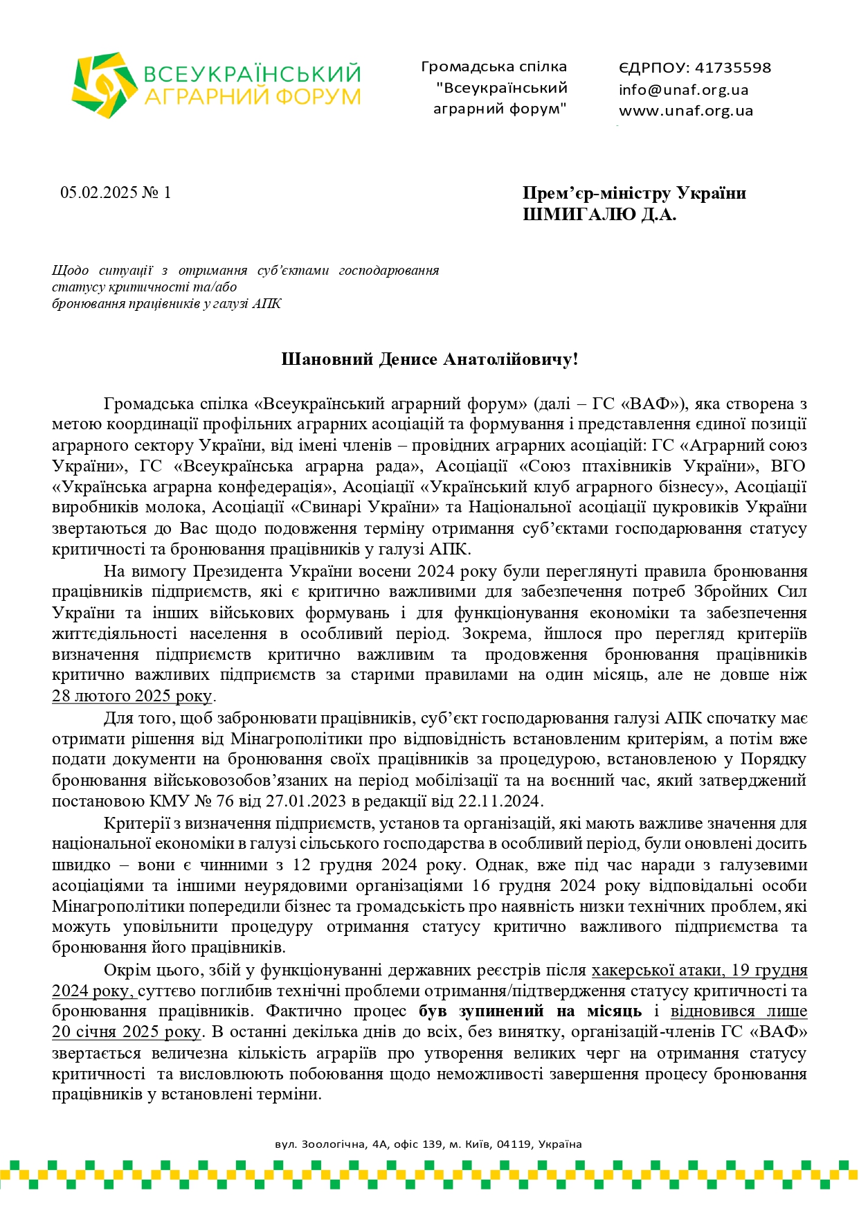 Асоціація «Свинарі України» разом з іншими учасниками ГС «Всеукраїнський аграрний форум» звернулися до прем’єр-міністра України з проханням подовжити термін отримання суб’єктами господарювання статусу критичності та бронювання працівників у галузі АПК до 31 березня 2025 року!