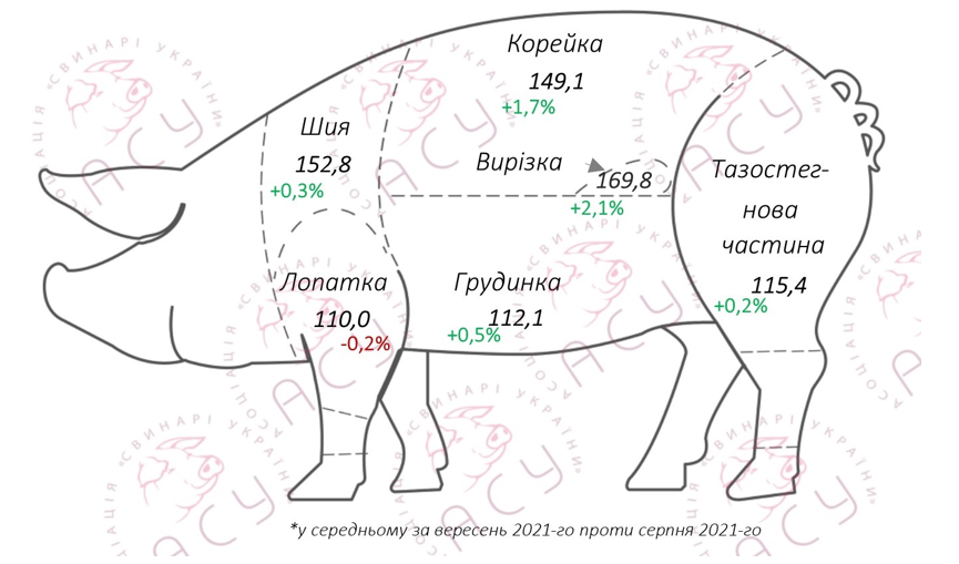 У профільній асоціації відзначають, що середня ціна кілограму свинини на полицях супермаркетів у вересні склала 131,4 грн/кг, що на 1% чи на 1,3 грн/кг дорожче за відповідний показник минулого місяця. При цьому, зміна цін залежно від виду частини варіювала від 0,2% до 2,1%. Так, практично не змінилися ціни на лопатку, ошийок та тазостегнову частину, тоді як вирізка та корейка у вересні були в середньому на 3,4 та 2,4 грн/кг (2,1% та 1,7%, відповідно) дорожчими ніж у серпні.