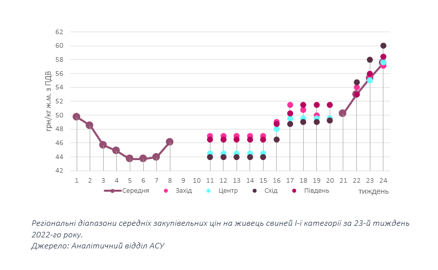 Позитивна цінова динаміка на вітчизняному ринку свинини, яка триває четвертий тиждень поспіль, продовжилася і в середині червня. У ході торгів попередньої п’ятниці виробники свинини «розписали» товарні партій на 1,8-3 грн/кг дорожче. Середньозважена ціна реалізації зросла на 2,2 грн/кг (+4% до попереднього тижня), сягнувши 57,5 грн/кг ж.м. При цьому ціновий коридор в Центрі та на Заході зрівнявся ― 57-59 грн/кг, на Півдні ціни тяжіють до 58-59 грн/кг, а дефіцит свинини на Сході спричинив підвищення цін до 60 грн/кг та вище.
