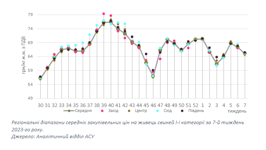 Ціни закупівлі на 7-й тиждень для більшості операторів зупинилися на середньоринковій позначці 65 грн/кг (-3% до попереднього тижня), а цьоготижневий ціновий коридор становив 63,5-66 грн/кг. Подекуди лунали й нижчі цінові пропозиції (61-62 грн/кг), проте виключно при закупівлі тварин важчої кондиції ― від 130 кг та вище.