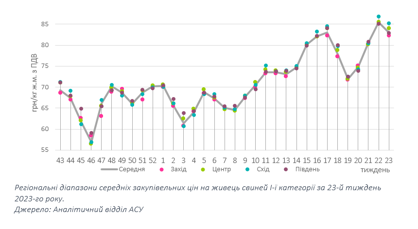 Перші торги червня завершилися незначним послабленням цін на ринку живця та посиленням регіональної розбіжності цін. Так, більшість товарних партій на Заході переважно реалізували по 82-83 грн/кг, у Центрі переважно звучали ціни в 83-85 грн/кг. Найвищі ціни— до 86 грн/кг та подекуди вище — фіксували на Сході. Середньозважена ціна зупинилася на позначці 83 грн/кг, що на 3% поступається її рівню попереднього тижня.