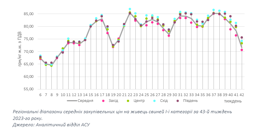 У кінці жовтня сезонне послаблення цін закупівлі свиней забійних кондицій продовжилося, констатують аналітики Асоціації «Свинарі України.