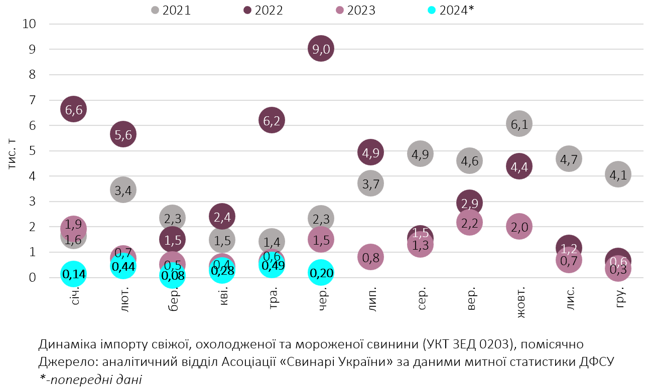 «Натомість експорт свинини у червні був у 1,5 раза більшим: протягом місяця за межі країни вивезли майже 296 т свинини сукупною вартістю близько 700 тис. дол. США. Загалом 2024-ий став дуже нетиповим роком для зовнішньої торгівлі свининою, адже за розрив між обсягами надходження м’яса свиней з-за кордону та експортом української свинини не такий значний. Так, сукупний імпорт за січень-червень становить 1,63 тис. т, що у 3,5 раза менше за обсяги завезеного за першу половину 2023-го, а експорт за цей період лише на чверть менший — 1,2 тис. т — і вже перевищує торішні обсяги відвантажень на зовнішні ринки. За зниження цін на внутрішньому ринку, яке спостерігається у першій половині року, це цілком закономірно: нижча внутрішня ціна створює бар’єр входу для імпортної свинини та водночас сприяє покращенню конкурентних позиції продукції на зовнішніх ринках».