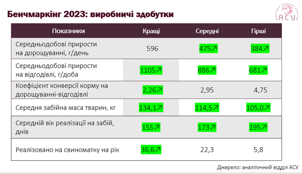 «За підсумками 2023-го спостерігаємо збільшення показників середньодобових приростів як на дорощуванні, так і на відгодівлі. Зокрема, середній рівень показника на дорощуванні додав понад 6% проти минулорічного у тому числі й завдяки істотному покращенню (більш ніж на 25%) мінімального показника вибірки. Показники темпів приросту тварин на відгодівлі також продемонстрували позитивну динаміку — діапазон їх варіації з 538-1093 г/доба у 2022-му підвищився до 681-1105 г/доба у 2023-му. Відповідно, спостерігалося і швидше досягнення забійної маси тваринами (за 155-195 днів торік проти 158-220 днів у 2022-му) за паралельного підвищення останнього. Так, якщо у рік повномасштабного вторгнення тварин в середньому реалізовували на забій масою 111,7 кг, то у 2023-му цей показник становив 114,5 кг. Крім цього, вибірка 2023-го встановила новий максимум з кількості реалізованих тварин у розрахунку на свиноматку на рік серед господарств закритого типу — 36,6 гол. чи на 5% вище за попередньо досягнутий рівень», — поділилися аналітики галузевого об’єднання.
