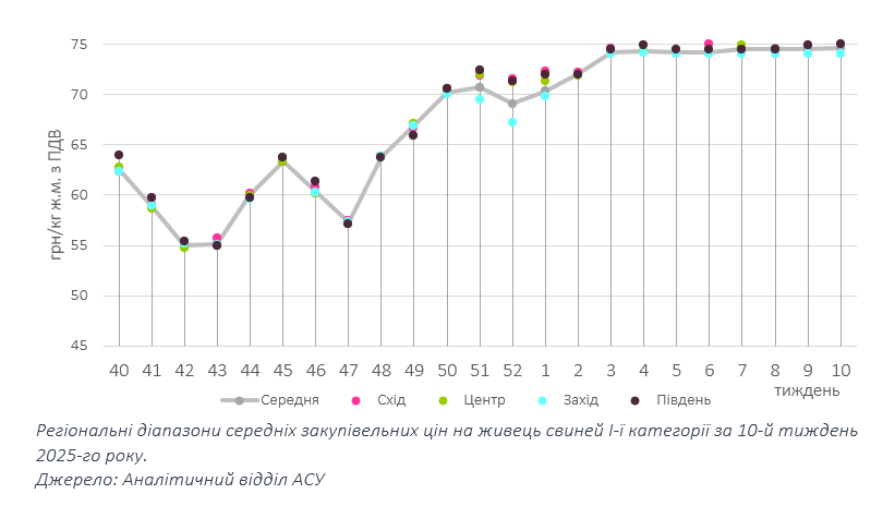 Хоча, як і тижнем раніше, більшість операторів не змінювали ціни закупівлі, на початку нового сезону відбулося розширення цінового коридору до 74–77+ грн/кг. Зокрема, вищі ціни фіксують на Сході, де нестача пропозиції живця найвідчутніша, тоді як мінімальні, як і попередньо, спостерігають на Заході країни. Утім істотного впливу на середньоринкову позначку наразі це не мало: на початку березня вона зупинилася на рівні 74,6 грн/кг.