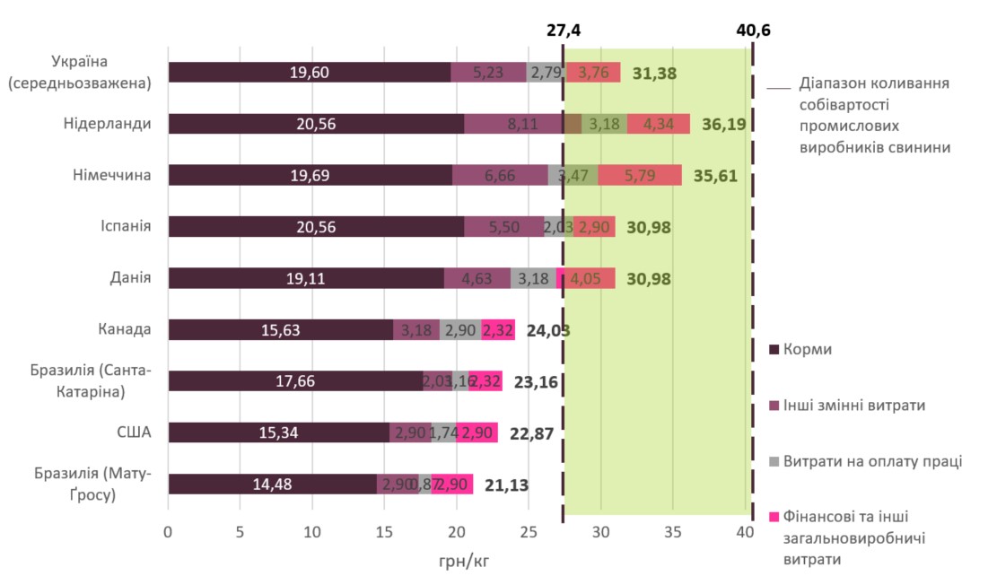 Дещо нижчі середньозважені витрати мають виробники свинини у Данії та Іспанії, які мають найкращі результати щодо собівартості серед країн ЄС. Так, Данія за рахунок високого рівня самозабезпеченості кормами має нижчу питому вагу витрат на годівлю в структурі собівартості. Іспанія має кращі середні показники конверсії корму, тобто вищу ефективність годівлі, яка компенсує дорожчі корми. Крім цього, питомі капітальні інвестиції в основні виробничі засоби в Іспанії практично вдвічі менші, ніж у Данії, що дає значну перевагу через менші постійні витрати свиногосподарств.