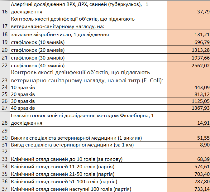 Минулого року після підписання Наказу Міністерства розвитку економіки, торгівлі та сільського господарства України №395 від 25.02.2021 «Про внесення змін до наказу Міністерства аграрної політики та продовольства України від 13 лютого 2013 року № 96» замість фіксованих цін у Наказі 96 були запроваджені коефіцієнти, які множаться на прожитковий мінімум (станом на 1-ше січня року). Тоді перехід на нову систему збільшив вартість діагностичних досліджень, обов’язкових для свиней впродовж профілактичного карантину перед/після переміщення, на 66%, а клінічного огляду — на 19–283% залежно від партії тварин. Цього року здороження менш відчутне.