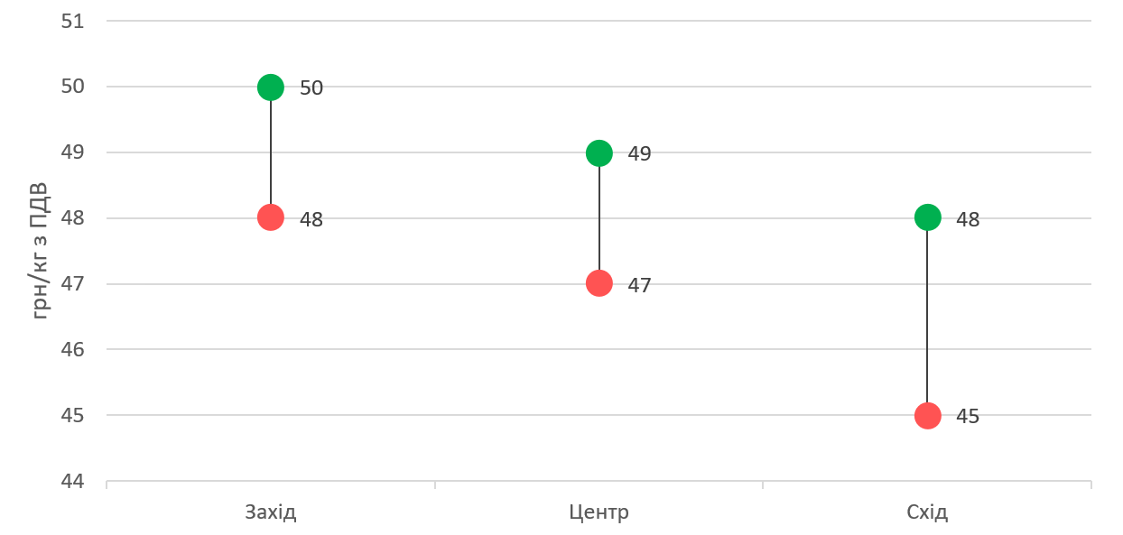 Підвищення котирувань дозволило дещо скоротити міжрегіональний розрив цін. Так, на Сході цього тижня ціни закупівлі коливалися в межах 45-48 грн/кг, в Центрі зросли до 47-49 грн/кг, а в західних областях передсвятковий діапазон становить 48-50 грн/кг.