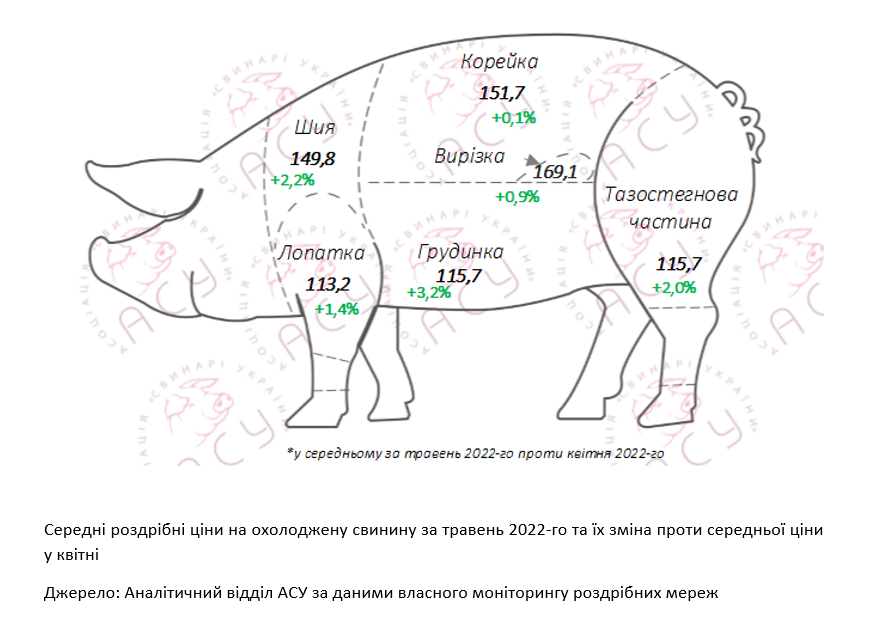 За травень свинина на полицях супермаркетів зросла в ціні на 1-3,5 грн/кг залежно від виду охолодженого напівфабрикату порівняно з попереднім місяцем, свідчать результати моніторингу ключових торгівельних мереж аналітичного відділу Асоціації «Свинарі України». «У кінці весни найпомітніше здороження торкнулося не преміальних стейку та вирізки, які подорожчали на 1,1 та 1,5 грн/кг, а «пікнікових» ошийка та грудинки — плюс 3,2 та 3,5 грн/кг до середньої ціни квітня відповідно. Крім цього, досить помітно зросла в ціні тазостегнова частина, додавши 2,25 грн/кг у середньому — з 114,3 грн у квітні ціна кілограма сягнула 116,6 грн/кг в середньому за підсумками травня», — зазначають в АСУ.