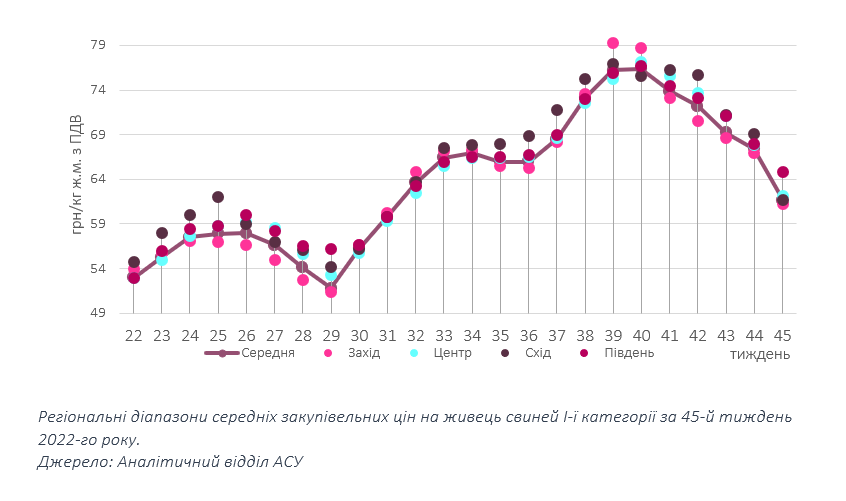 Торги на 45-й тиждень завершилися послабленням закупівельних цін на живець свиней, свідчать підсумки щотижневого моніторингу Асоціації «Свинарі України». Так, середньоринкова позначка цього тижня зупинилася на рівні 61,7 грн/кг, що на 8,5% поступається показнику початку місяця. Цього тижня сильніше проявилася неоднорідність співвідношення попиту та пропозиції товарного поголів’я свиней в різних регіонах країни. Тож хоча більшість товарних партій «розписали» по 60,5-64 грн/кг, цінові позначки вище згаданого максимуму непоодинокі. Зокрема, найвищі ціни цього тижня фіксують на Півдні та подекуди у Східних областях.