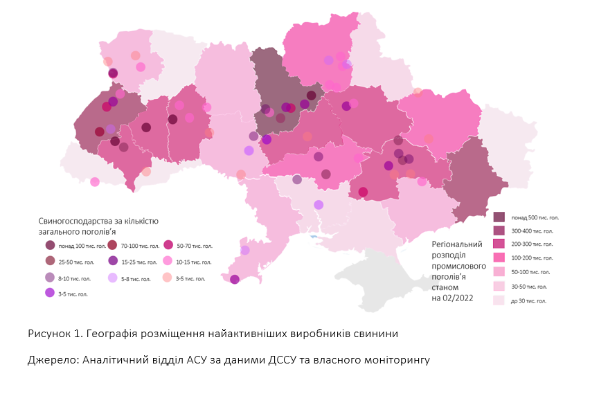 Ще однією відмінністю від попередніх зрізів стало зниження «вхідного порогу» за кількістю маточного поголів’я, що дозволило розширити вибірку меншими проте не менш проактивними виробниками свинини. При цьому групування цьогорічних учасників за регіонами підкреслює географію розміщення ключових гравців ринку та території з вищою концентрації господарств (рисунок 1). Так, основні ареали скупчення найактивніших виробників свинини представлені трьома кластерами: в Центрі — Київщина, Черкащина та Полтавщина, на Заході — Львівщина, Івано-Франківщина та Тернопільщина, а на Сході — Дніпропетровщина.