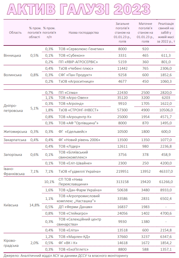 Щорічно Асоціація «Свинарі України», сайт PigUa.info та журнал «Прибуткове свинарство» збирають рейтинг найпотужніших промислових свиногосподарств України. Через початок повномасштабної війни минулого року від цієї традиції відступили. Проте у 2023-му найактивніші гравці ринку готові заявити про себе.