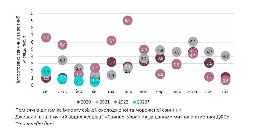 «На противагу попереднім рокам, низька імпортна активність створила нетиповий важіль підтримки для внутрішніх цін на ринку свинини, адже сировина з-за кордону наразі не створює конкуренцію вітчизняній. Це пов’язано із тривалим підвищенням цін на свинину в країнах ЄС, яке триває з січня та, хоч і трохи уповільнилася в квітні, але не зупинилося. Відповідно, «прохідні» по ціні позиції для українського ринку вітчизняним імпортерам знаходити складніше: середня ціна кілограму завезеної свинини у квітні зросла до 2,4 дол. США проти 1,88 дол. США/кг у березні», — коментують в Асоціації «Свинарі України».