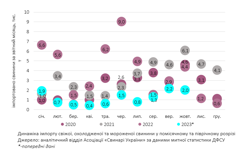 «У жовтні імпорт свіжої, охолодженої та мороженої свинини (УКТ ЗЕД 0203) склав 2,0 тис. т чи 5,5 млн дол. США у валютному еквіваленті. Це на 6,8% менше ніж у вересні та удвічі менше ніж у жовтні 2022-го. Ослаблення потоку закордонної свинини спостерігалося по мірі аналогічної динаміки внутрішніх цін: з початку місяця середньоринкова ціна втратила майже 18%, а середній жовтневий показник —майже 12% проти вересневого», — повідомляють в аналітичному відділі Асоціації «Свинарі України».