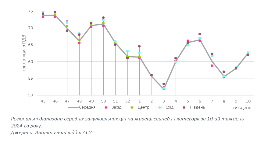Не дивлячись на напруженість перемовин минулої п’ятниці, торги для операторів вітчизняного ринку свинини завершилися зміцненням цін заготівлі. Більшість товарних партій цього тижня закуповували у межах 61–63 грн/кг. Ціни нижче згаданої мінімальної позначки зустрічалися епізодично, а середньозважена ціна в усіх регіонах країни тяжіє до 62,5 грн/кг.