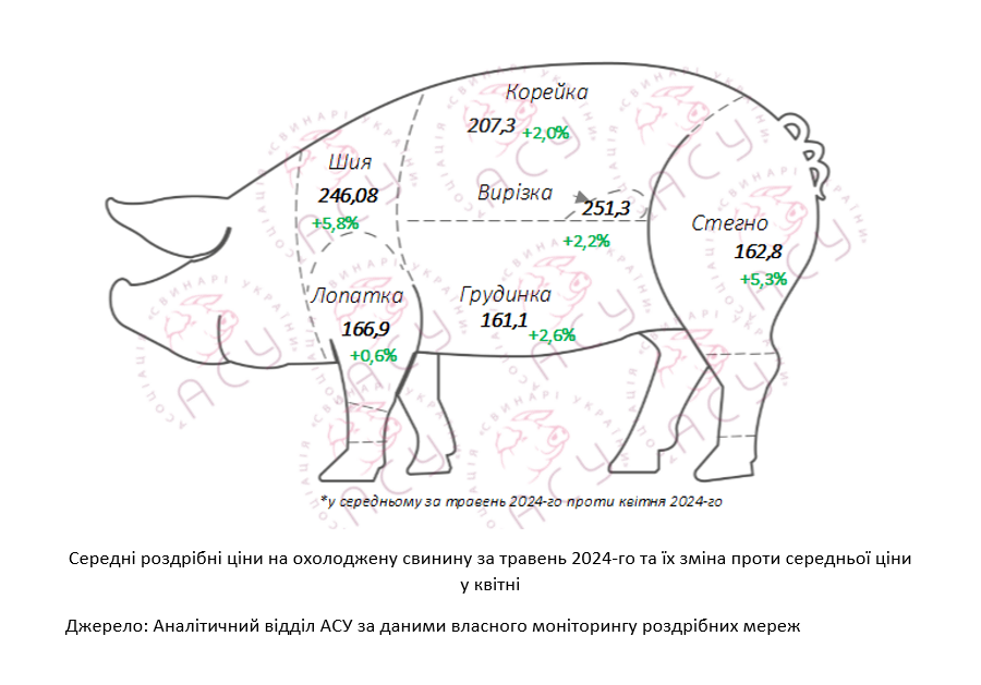 «Якщо живець у травні був на 4,9% дешевший, ніж у квітні, то охолоджені свинячі напівфабрикати, навпаки, подорожчали на 2,5%. При цьому, найпомітніше підвищилися ціни на популярні у сезон пікніків свинячі ошийок та стегно — плюс 5,8% та 5,3% до середньої ціни у попередньому місяці. Проте інші частини також додали у ціні: корейка, вирізка та грудинка подорожчали на 2–2,6%».