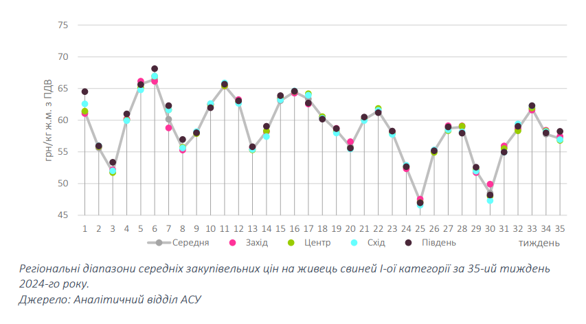 У відповідь на незначну зміну закупівельних цін, котирування на охолоджені свинячі півтуші переважно відреагували зниженням мінімальних позначок цінових коридорів, тоді як максимальні лишилися без змін. Щодо очікувань цінової динаміки на наступному тижні, то більшість представників м’ясопереробки поки не поспішають із прогнозами. Натомість деякі з них інформують про ускладнення реалізації м'яса через перебої з електроенергією: заклади роздрібної торгівлі зменшують замовлення чи відтерміновують відвантаження, низка боєнь змушені зробити відповідні зміни у графіку забоїв і поставок живця. Втім, свідчення інших переробників вказують на те, що така ситуація не повсюдна, адже більшість операторів ринку м’яса (як з боку переробки, так і з боку кінцевої реалізації) вже підготовані до таких викликів та адаптувалися до роботи у форс-мажорних умовах.