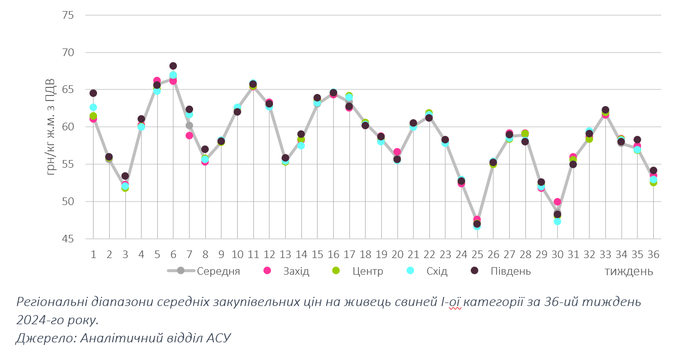 У ході торгів минулого тижня ціни закупівлі не втрималися на досягнутому рівні, тож на початку осені котирування «просіли» на 2,5–5 грн/кг порівняно з кінцем літа. У більшості випадків ціни закупівлі кондиційної свинини варіювалися в межах 52–55 грн/кг, а регіональна розбіжність цін стала відчутнішою. Згадана нижня цінова межа була «робочою» для Сходу, тоді як в інших частинах країни фіксують вищі ціни. Середньозважена ринкова позначка зупинилася на рівні 52,9 грн/кг, втративши 7,3% проти минулотижневої.