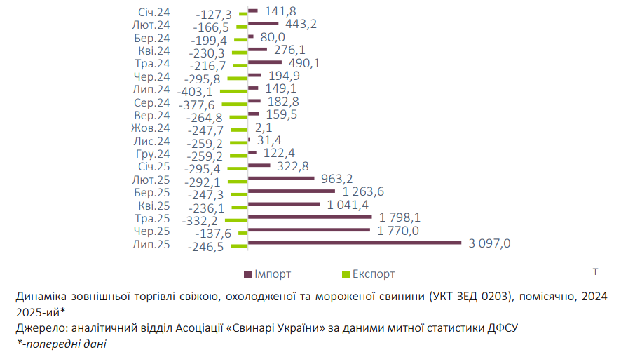 Сукупне надходження імпортованої свинини за 7 місяців 2025-го склало 10,27 тис. т на 25,8 млн дол. США у валютному вираженні, що вже перевищує торішній показник.