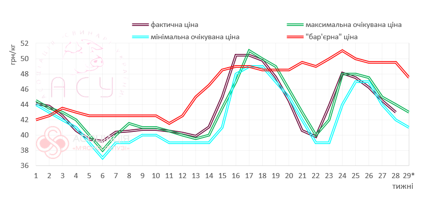 Представники переробної галузі не виключають подальшого «просідання» діапазону закупівельних цін. За результатами опитування учасників Асоціації «М’ясної галузі» мінімальна цінова позначка наступного тижня може опуститися нижче 41 грн/кг, а більшість операторів планує закуповувати живець не дорожче 43 грн/кг. З іншого боку, млявість літньої торгівлі незабаром може збалансувати обмеженість пропозиції живця через повільніший приріст тварин у літню пору.