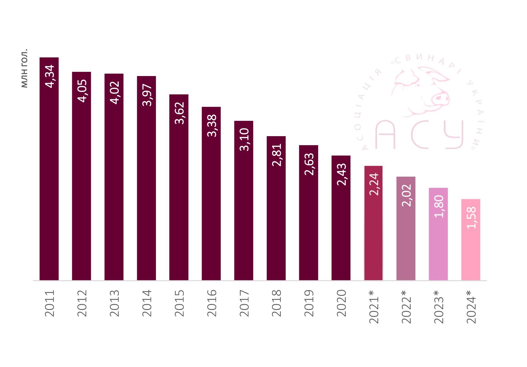 «Згідно з даними останніх п’яти років поголів’я свиней у присадибному секторі у середньому скорочується на 8% щорічно. Так, за 2015-2019 рр. кількість свиней в індивідуальних селянських господарствах скоротилася на 1 млн голів: з 3,6 млн гол. до 2,6 млн гол. у минулому році. Враховуючи таку тенденцію, упродовж наступного п’ятиріччя країна може втрати ще близько мільйона свиней через згортання присадибного свинарства,» — підсумовує пані Юрченко.