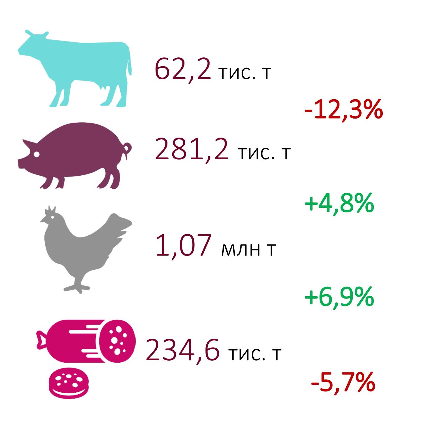 Так, у 2019-му виробництво яловичини, послабившись на 12,3%, склало 62,2 тис. т. Виробництво м’яса птиці та свинини, навпаки, зросло: плюс 6,9% (до 1,07 млн т.) та 4,8% (до 281,7 тис. т), відповідно.