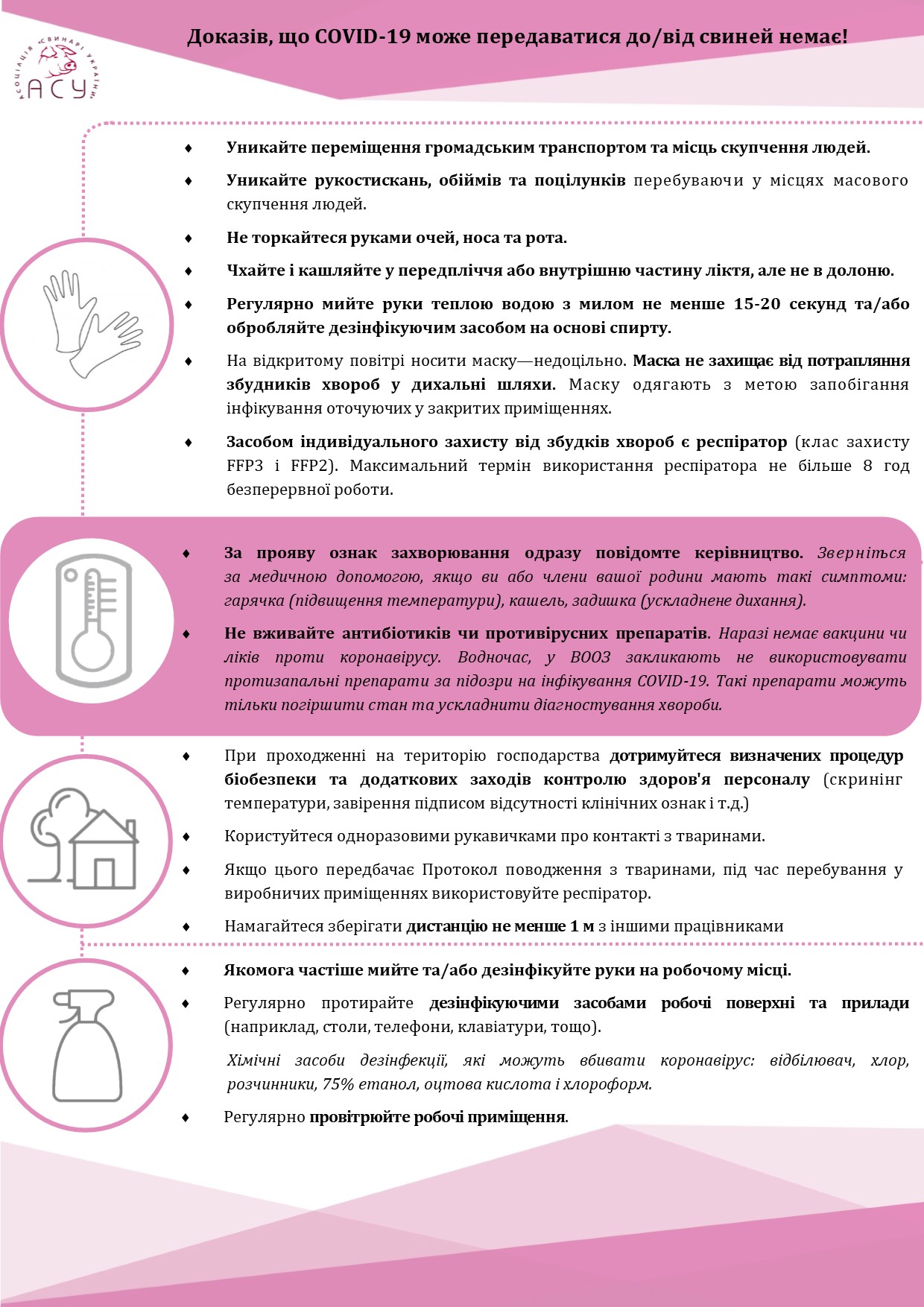 Більше того, працівникам ферм необхідно при роботі з тваринами користуватися одноразовими рукавичками та респіраторами (якщо цього передбачає Протокол), регулярно протирати дезінфікуючими засобами робочі поверхні та прилади, наприклад, робочі столи, телефони, клавіатури тощо. Також необхідно слідкувати, аби як мінімум 2 рази на день проводилося прибирання робочих місць (очищення поверхонь, стільців та дверних ручок тощо) та провітрювання приміщень.