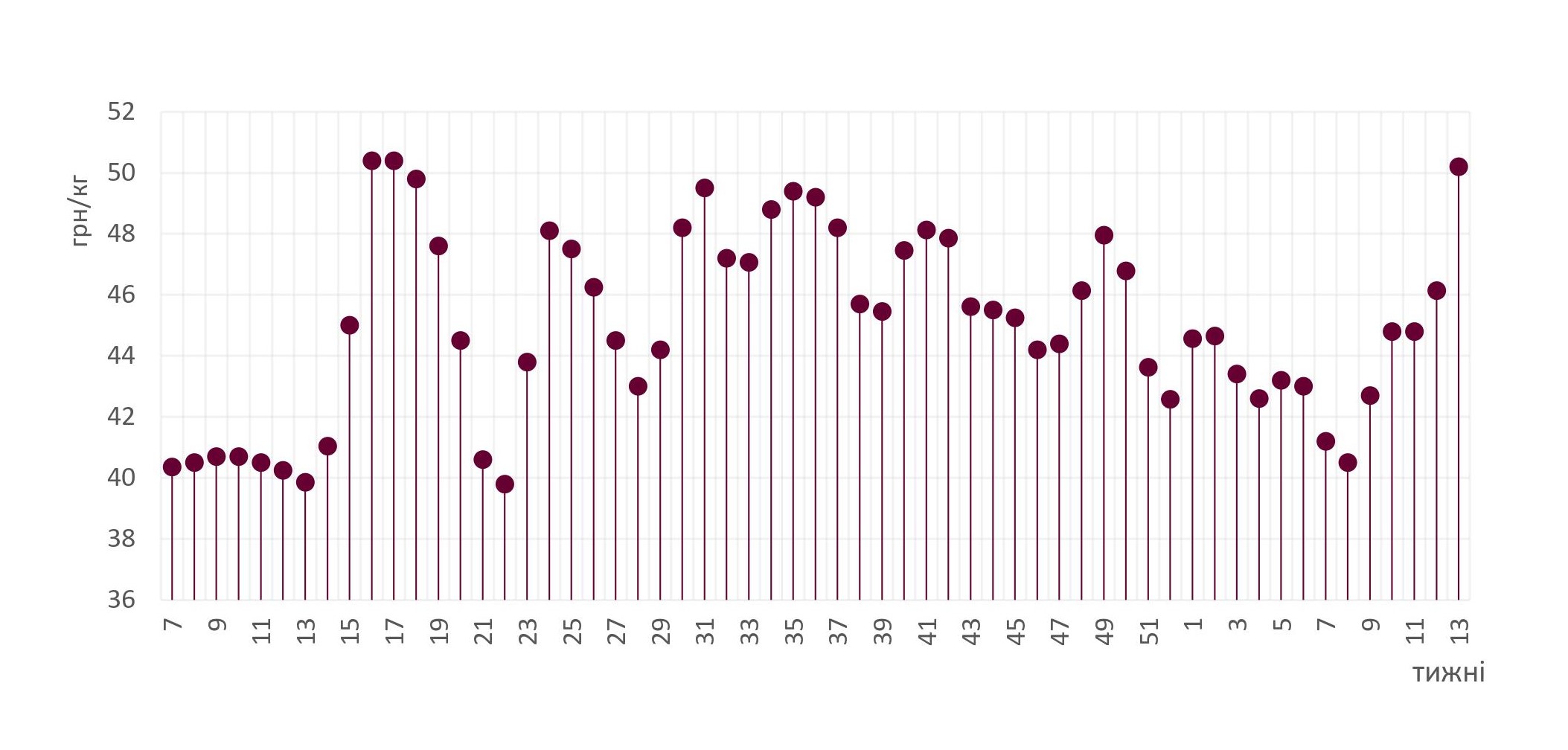 Кінець березня відзначився відчутним стрибком цін закупівлі на свиней забійних кондицій. Так, за тиждень середньоринкова позначка піднялася на 8,8%, перевищивши 50 грн/кг.