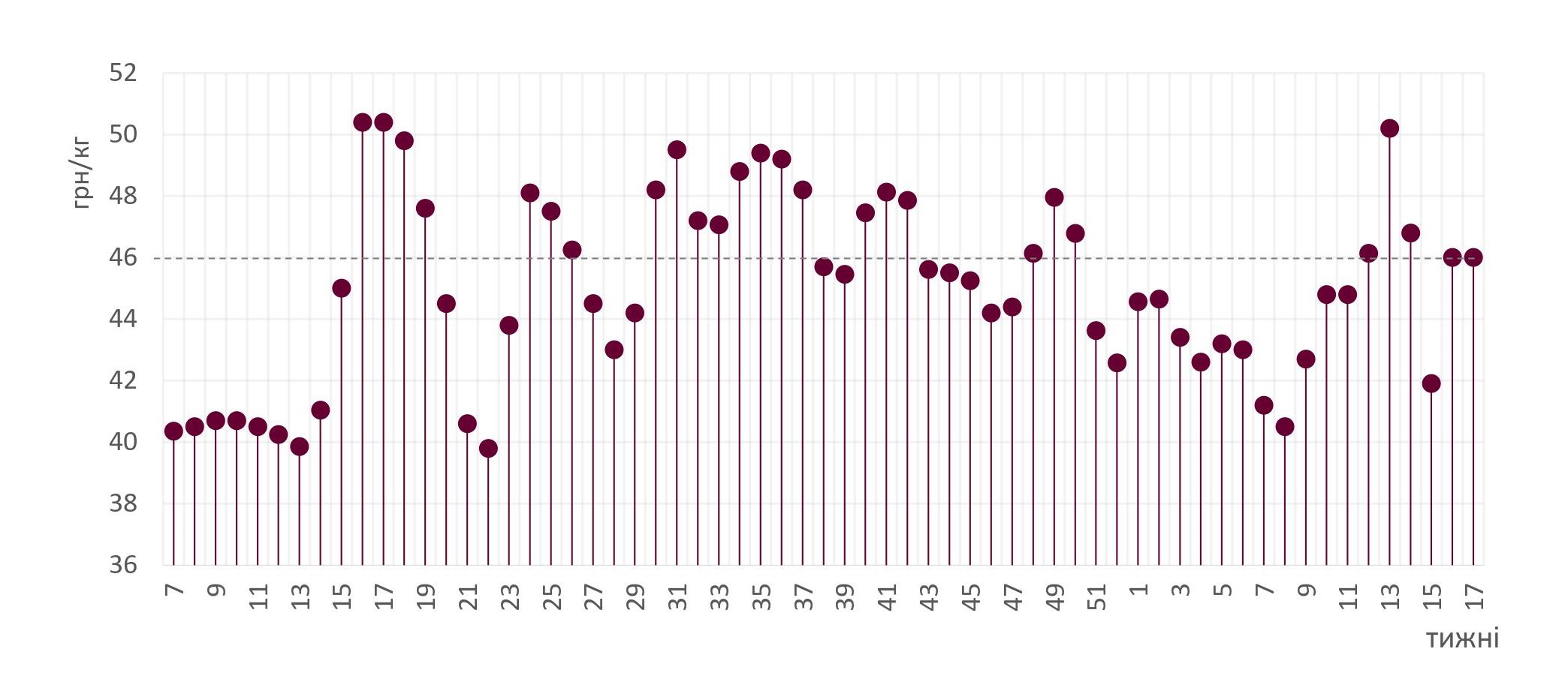 У ході передостанніх торгів квітня котирування втрималися в межах минулотижневого діапазону: більшість товарних партій реалізували по 44-46,5 грн/кг, вищі ціни зустрічалися епізодично. Зміна цін окремих операторів мала різноспрямований характер та не перевищувала 0,5 грн/кг.