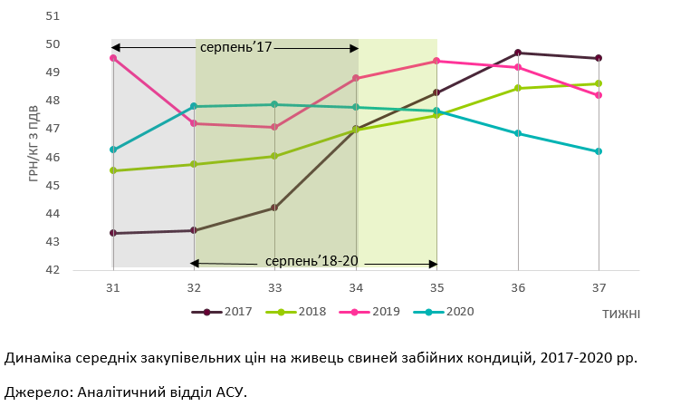 «Щороку в серпні відбувається зростання цін на свинину в закупівлі під впливом сезонно меншої пропозиції. Так, спекотні погодні умови пригнічують апетит свиней, відповідно падає показник середньодобових приростів, а значить тваринам потрібно більше часу для досягнення звичної забійної кондиції. Як наслідок, обсяги товарних партій від виробників свинини та середня забійна маса тварин меншають, що відповідно впливає на загальну пропозицію м’яса свиней. Це за відносно сталого попиту з боку заготівельників створює дефіцит кондиційних свиней, тож «підігріває» ціну на ринку живця. Свого максимуму вона переважно сягає на рубежі сезонів чи у першій половині вересня», — роз’яснює Олександра Бондарська, керівник аналітичного відділу Асоціації.