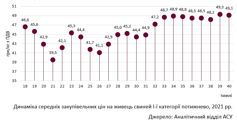 У перший тиждень жовтня ціни реалізації свиней забійних кондицій коливалися в межах 48-50 грн/кг. Для більшості постачальників котирування збереглися на рівні попереднього тижня. Епізодично відзначили незначне негативне коливання (мінус 0,15-0,5 грн/кг), що посунуло нижню межу цінового коридору до 48 грн/кг. Проте значного впливу на середньоринкову ціну не мало: показник послабився менше ніж на піввідсотка проти попереднього тижня та залишається ближчим до вищої цінової позначки — 49,1 грн/кг.
