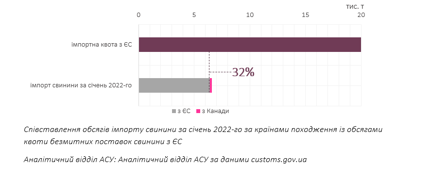 «Пожвавлена імпортна активність зокрема спричинена початком «нового відліку» квот на безмитне завезення свинини. Так, в кінці третього та в четвертому кварталі 2021-го, коли відповідні квоти були вичерпані, імпортери були зобов’язані сплачувати 10% мито при завезенні мороженої та 12% при імпорті охолодженої свинини. З початку року вітчизняні імпортери знову можуть користуватися такими «пільгами». З іншого боку, враховуючи набрані темпи надходження м’яса свиней з-за кордону, цьогоріч ці квоти будуть вичерпані значно раніше. Так, за перший місяць року їх вичерпали на 32%. Тож якщо імпортна активність залишиться на цьому ж рівні, вже з квітня такі поставки можуть автоматично «подорожчати» на 10-12% для вітчизняних трейдерів», — зазначають аналітики АСУ.