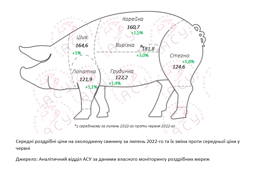 Водночас, в АСУ констатують, що цінова динаміка закупівельних цін та роздрібної торгівлі у липні була розсинхронізована: «Хоча у перші три тижні ціни закупівлі свиней забійних кондицій мали негативну динаміку (щонайменше -8%), на полиці це врешті відобразилося лише у кінці місяця і пониження склало 1-4 грн/кг (1-3%). Виняток склав лише ошийок, який, навпаки, у кінці місяця подорожчав на 2%. Відставання реакції роздрібних цінників на зміну цін закупівлі «сировини» на 5-7, іноді 10 днів — звична ситуація для ринку свинини. З іншого боку, сягнувши високого рівня, роздрібні ціни не так оперативно транслюють здешевлення сировини», — коментують в АСУ.