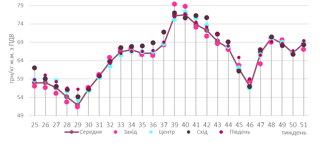 У передостанній тиждень року ціни на живець свиней забійних кондицій зросли на 2-4 грн/кг проти показників попереднього тижня, констатують вітчизняні виробники свинини. Більшість товарних партій цього тижня закуповували по 68-70 грн/кг, проте подекуди зустрічалися і нижчі ціни, зокрема на Сході та Заході. Середньозважена ціна закупівлі зупинилася на рівні 68,6 грн/кг, що на 3,9% вище за показник попереднього тижня.