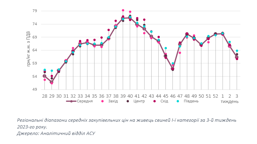 Після зимових свят ціни на свиней забійних кондицій традиційно послабилися: зі зниженням споживчої активності у другій декаді місяця, відповідної зміни зазнали ціни закупівлі свинини живою масою. Крім цього, у другій половині січня характернішою стала і регіональна розбіжність цін. Так, у ході попередніх торгів у Центрі живець переважно реалізували по 61-63 грн/кг, тоді як Сході та Заході ціни закупівлі тяжіли до 60 грн/кг.