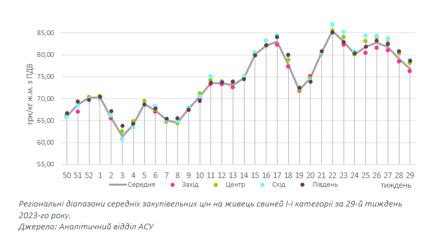 Середньозважена ціна закупівлі свинини живою масою втратила 3% проти попереднього тижня, зупинившись на позначці 76,8 грн/кг. Так, хоча на Сході, в Центрі та у південних областях ціни закупівлі цього тижня переважно коливалися в межах 77-79 грн/кг, помітно нижчі ціни в західних регіонах (75-76,5 грн/кг) продовжують «тягнути» цінову криву у бік зниження.