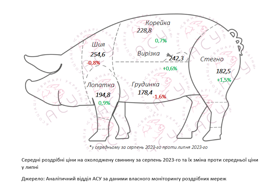 Упродовж серпня ціни на охолоджені свинячі напівфабрикати на прилавках супермаркетів коливалися незначно — в межах 205,6-206,5 грн/кг, зауважують в аналітичному відділі Асоціації: «Середня роздрібна ціна за підсумками місяця додала +0,4% чи 0,8 грн/кг до попередньо досягнутого рівня, зупинившись на позначці 206,13 грн/кг. При цьому, ціна окремих свинячих частин коливалася як бік підвищення, так і в бік пониження в межах 1,5% порівняно із середньою ціновою позначкою минулого місяця. Так, наприклад, стегно та стейк подорожчали, а грудинка знизилася в ціні».