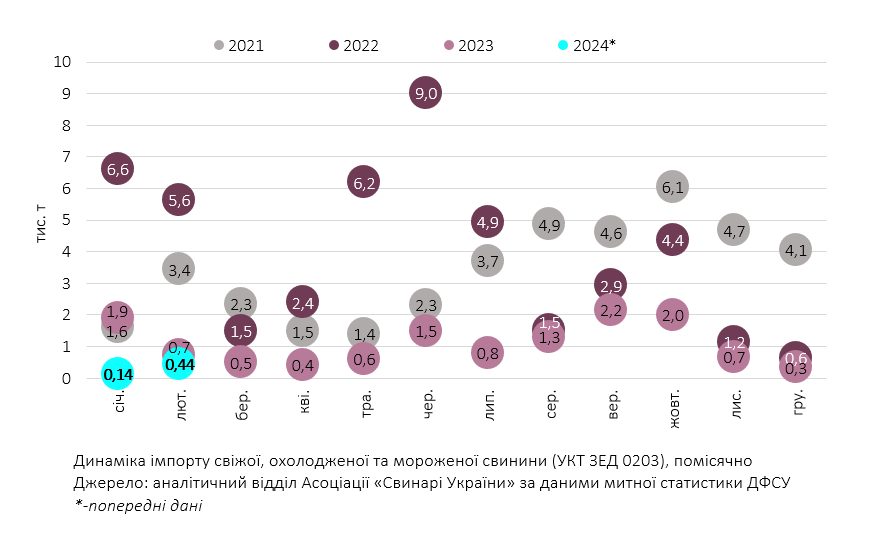 «Середня митна вартість завезеного у лютому кілограма свіжої, охолодженої та мороженої свинини склала 2,4 дол. США проти 2,73 дол. США місяцем раніше. Зниження митної вартості сировини на 12% дозволило втричі збільшити обсяги надходження свинини з-за кордону, порівняно з попереднім місяцем, проте вони залишаються малопомітними на ринку. Так, сукупний імпорт з початку року не перевищує 600 т, що у 4,5 рази менше за кількість імпортованої свинини у січні–лютому 2023-го», — зауважують в АСУ.