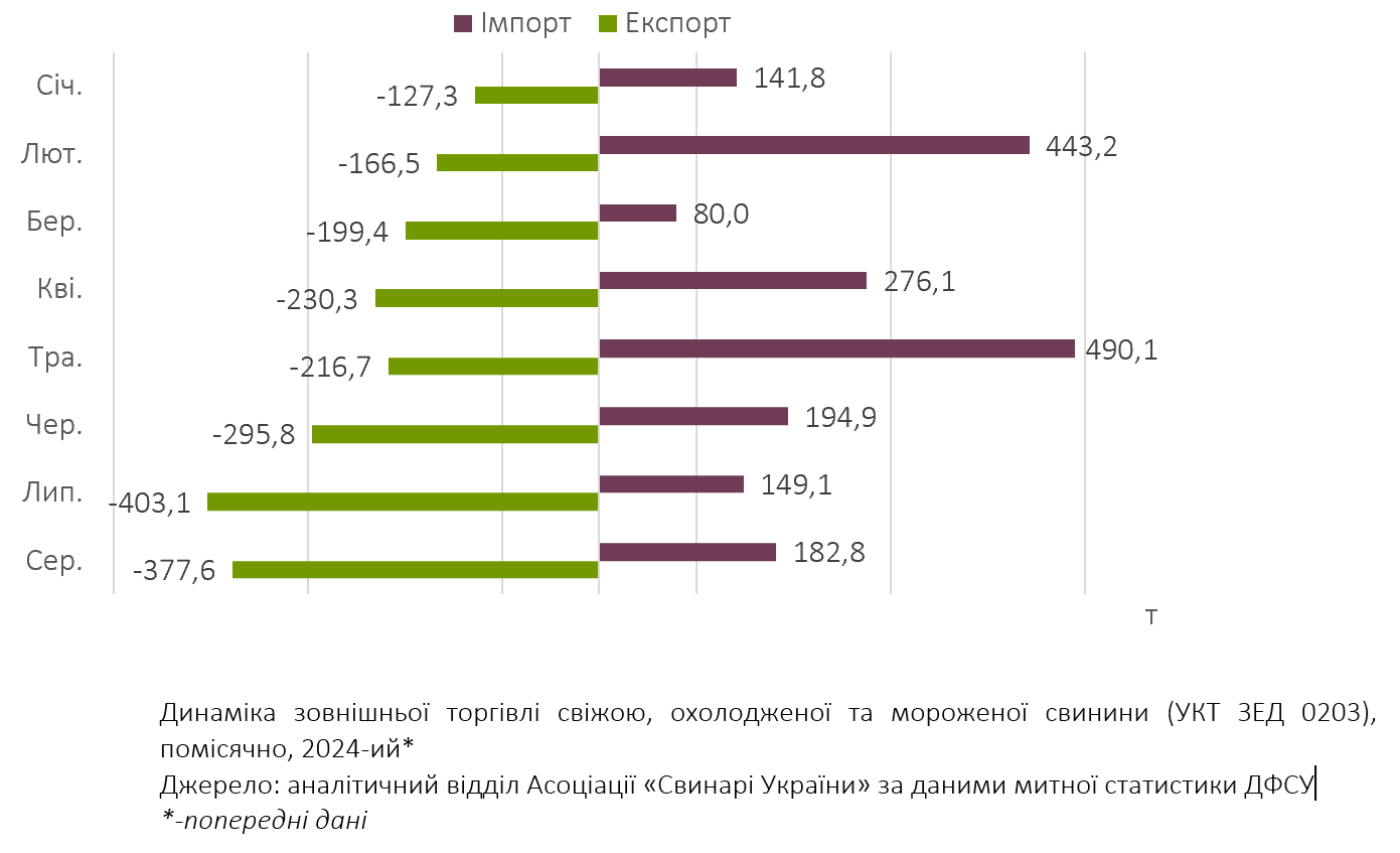«За попередніми оцінками протягом серпня до України завезли 183 т (+22,6% до липневого показника) охолодженої та мороженої свинини з країн ЄС вартістю 446 тис. дол. США. Середня митна вартість імпортованої свинини дещо зросла до 2,44 дол. США/кг, що на 0,48 дол. США дорожче ніж у липні. Утім, сумарні надходження свинини з-за кордону за вісім місяців 2024-го менші за 2 тис. т, що вчетверо поступається минулорічним обсягам імпорту за відповідний період. Так, корекції внутрішніх цін у бік підвищення у серпні було недостатньо, щоб стимулювати імпортну активність, тож вплив цього чинника на ринкову ситуацію залишається незначним», — коментують в АСУ.