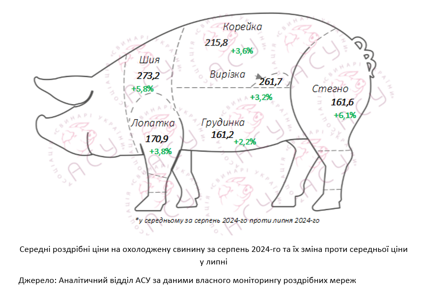 «Преміальні свинячі напівфабрикати чи ті, попит на які сезонно вищий, далеко не завжди „йдуть в ногу” зі загальним трендом. Так, наприклад, стейк, вирізка та ошийок цьогоріч дорожчі, а серпневий приріст цін на затребуваніше м’ясо шиї та стегна, демонструють вищі за середні темпи приросту цін», — роз’яснили в АСУ.