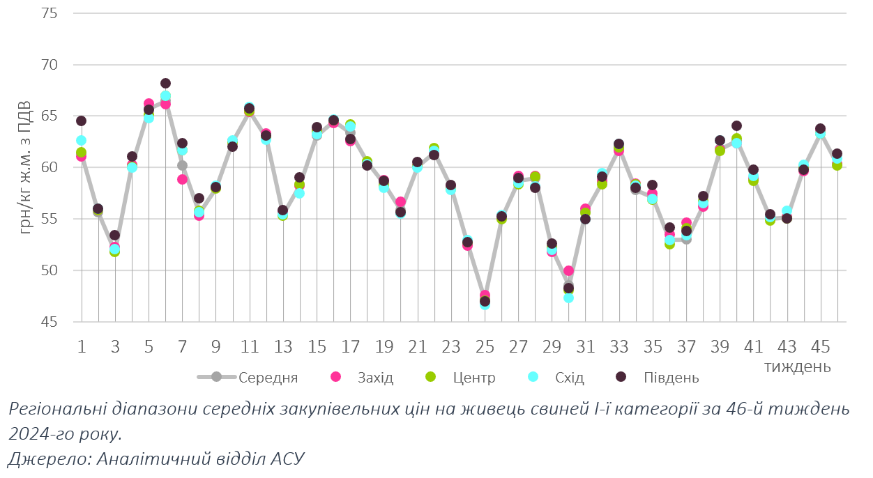 Торги минулої п’ятниці завершилися переглядом закупівельних цін на 2-4 грн/кг у бік пониження. Так, кондиційних товарних свиней цього тижня здебільшого закуповують по 59-61,5 грн/кг. Дещо нижчі за вказаний ціновий мінімум пропозиції точково звучать на Сході, проте оператори відзначають, що це переважно стосується тварин більшої за стандартну забійну масу. Загалом наразі зберігається регіональна розбіжність цінових котирувань на живець свиней із нижчими цінами на Сході та вищими на Заході та в Центрі. Середньоринкова позначка цього тижня дорівнює 60,3 грн/кг, що на 4,8% нижче ніж на початку місяця.