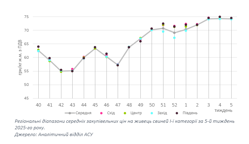 За підсумками торгів минулого тижня більшість операторів ринку живця продовжили працювати за цінами попереднього. Так, свиней забійних кондицій переважно закуповували 74–75 грн/кг. Хоча точково зустрічаються котирування на 1 грн/кг вищі та нижчі вказаних, як і тижнем раніше, проте як правило тяжіють до попередньо вказаного коридору. Середньозважена ціна кілограма закріпилася на рівні 74,2 грн/кг.