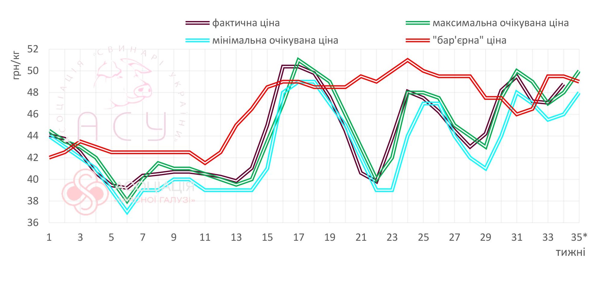 Упродовж передостаннього тижня літа ціна на свиней забійних кондицій коливалася в межах 47,5-50 грн/кг. Середньоринкова позначка початку другої декади піднялася до 48,8 грн/кг, що на 3,6% вище ніж тижнем раніше. Тож очікування виробників свинини стосовно пожвавлення цін перед тривалими святковими вихідними реалізувалися: за результатами торгів у кінці попереднього тижня свинарі «розписали» товарні партії на 1-2,5 грн/кг дорожче. Окрім сезонно обмеженої пропозиції свиней забійних кондицій, вагомий вплив мав і вимушений вихід одного з великих підприємств на Заході країни. У наслідок цього, змінилася географія заготівлі операторів західних областей, які шукають нових контрагентів і в центральній частині країни.
