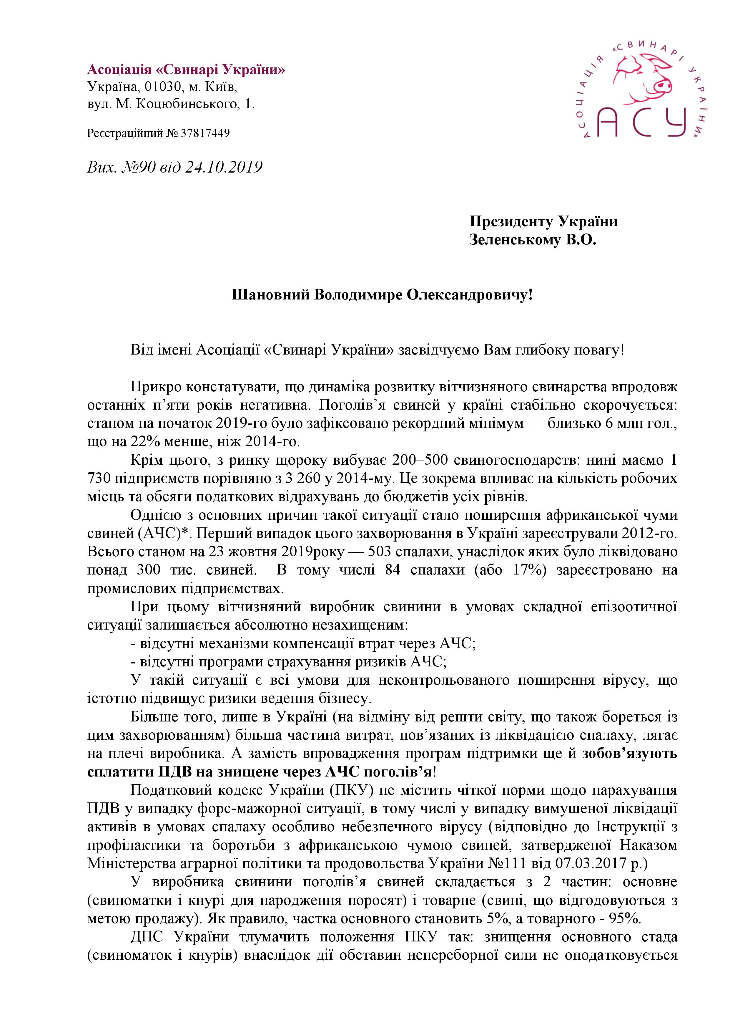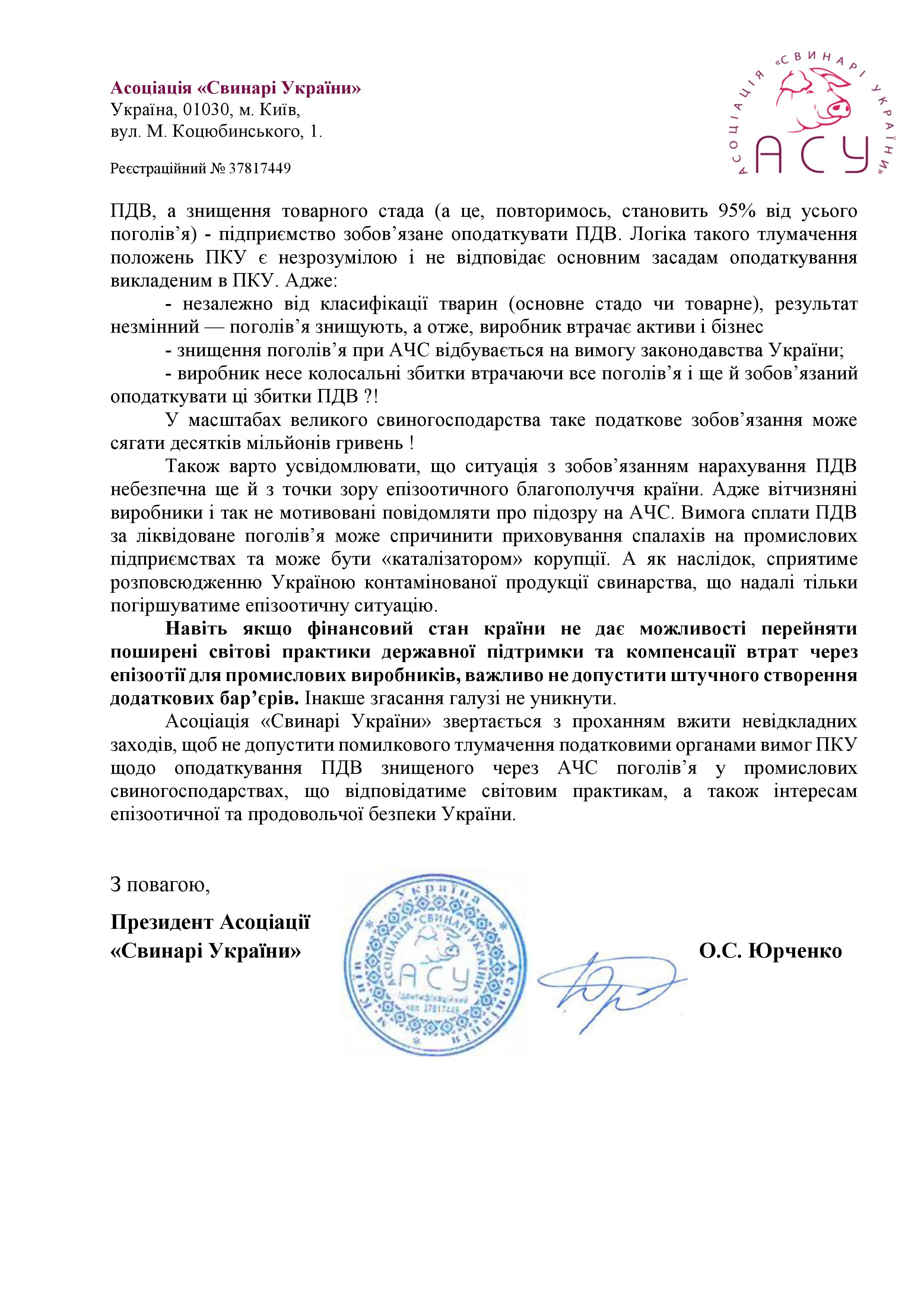 У зв’язку з цим, Асоціація «Свинарі України» направила листи-звернення на ім’я Президента України, Міністра розвитку економіки, торгівлі та сільського господарства та очільників фіскальної та податкової служб України з проханням переглянути вимоги щодо зобов’язання сплати ПДВ на знищене через АЧС поголів’я у промислових свиногосподарствах.
