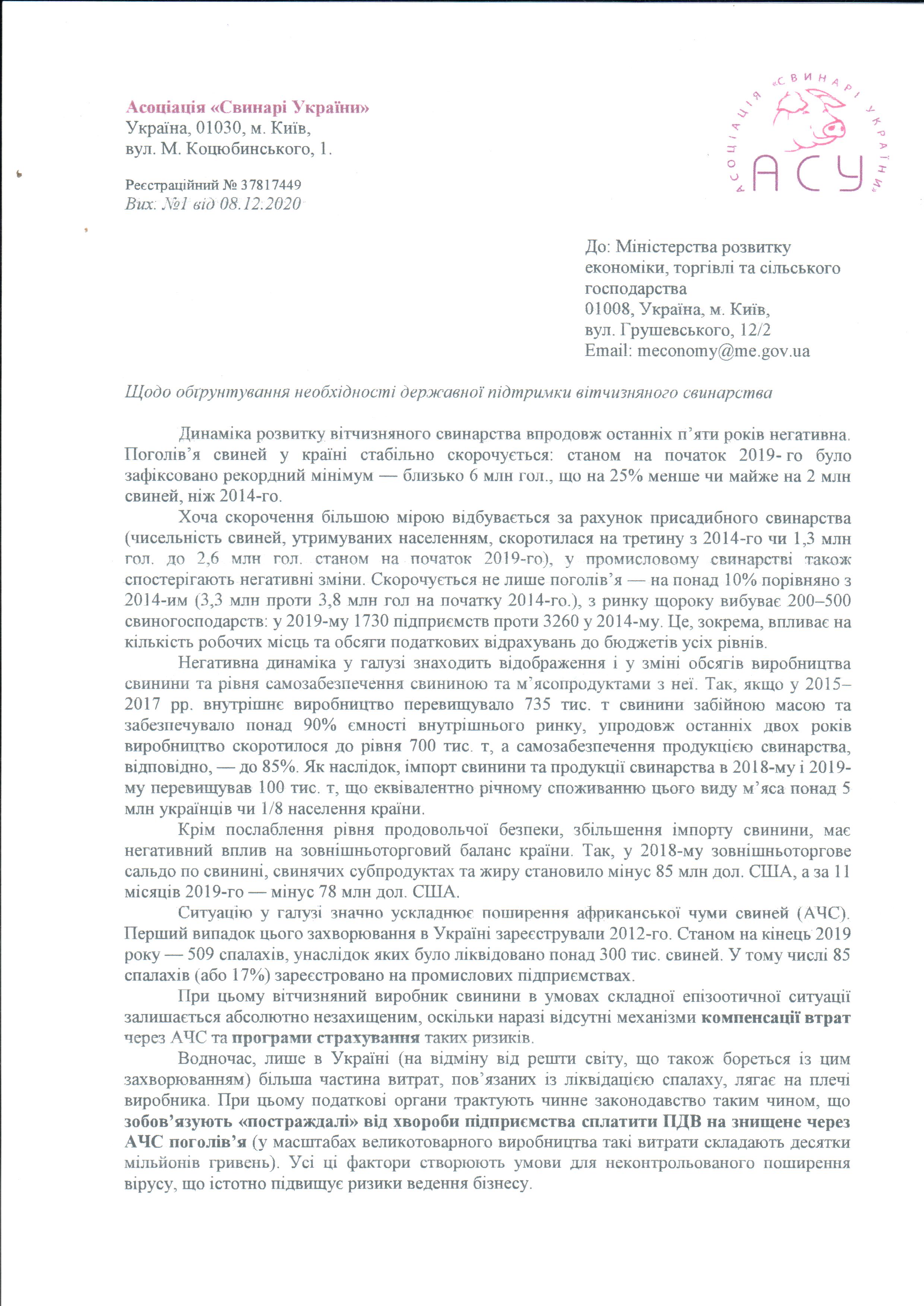 АСУ направила до Мінекономіки листа з пропозиціями щодо механізмів підтримки свинарства